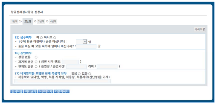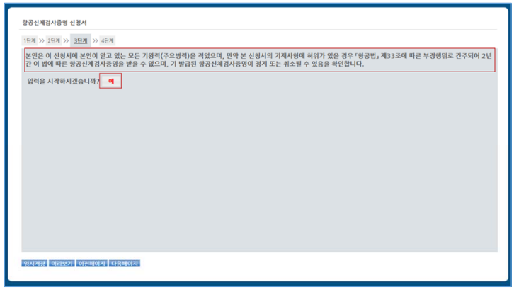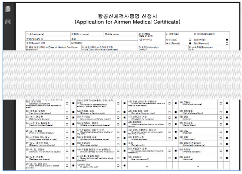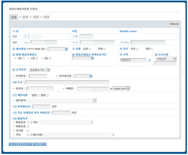 ③ [미리보기] 버튼을 클릭하면 지금까지 작성한 내용을 입력된 내용을 항공 신체검사증명 신청서 양식으로 확인이 가능합니다.