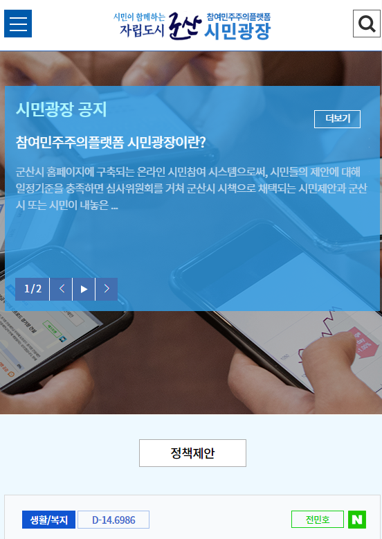 또한 참여민주주의플랫폼인 시민광장을 통해서 군산시 홈페이지에 구축된 온라인 시민참여시스템을 바탕으로 시민들의 제안에 대해 일정기준을 충족하면 심사위원회를 거쳐 군산시 시책으로 채택되는 시민제안과 군산시 시민이 내놓은 제안을 설문조사를 통해서 정책에 반영하고 있습니다.
