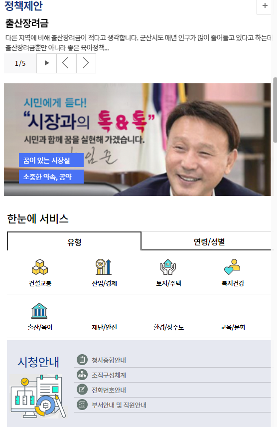 또한 시민에게 듣다를 개설해서 시민과의 소통 창구를 열어놓았으며 시청에서 해결할 수 있는 민원인 건설교통, 산업/경제, 토지/주택, 복지건강, 출산/육아, 재난/안전, 환경/상수도, 교육/문화 등을 한눈에 볼 수 있도록 서비스하고 있습니다.