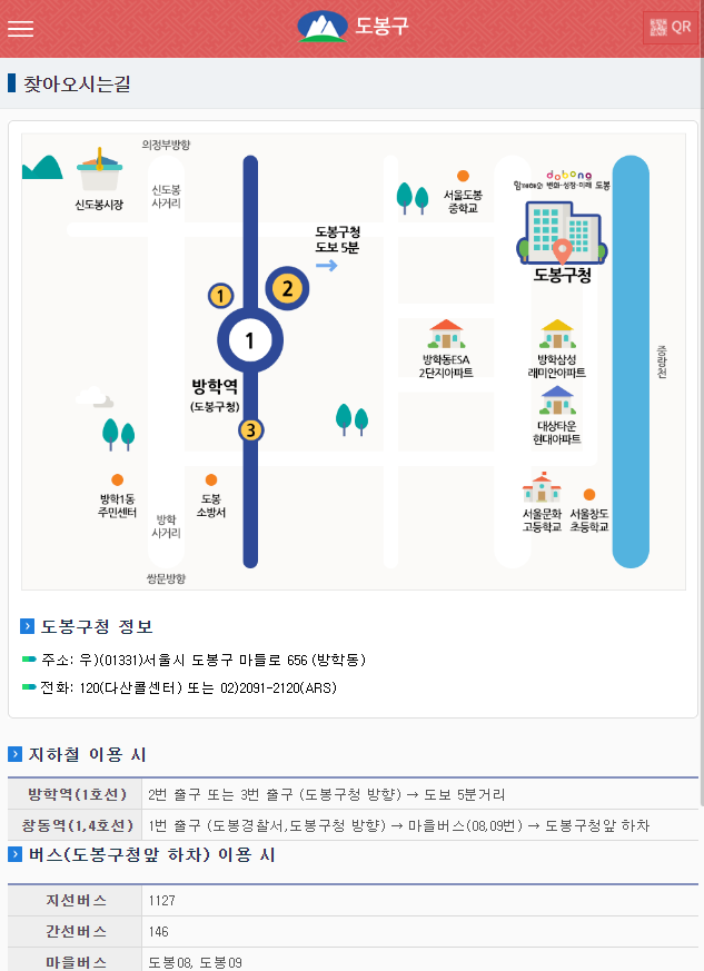 찾아오시는길 메뉴에서는 도봉구청의 주소와 전화번호 그리고 지하철이나 버스 이용시 도봉구청까지 접근할 수 있는 방법을 안내하고 있습니다.