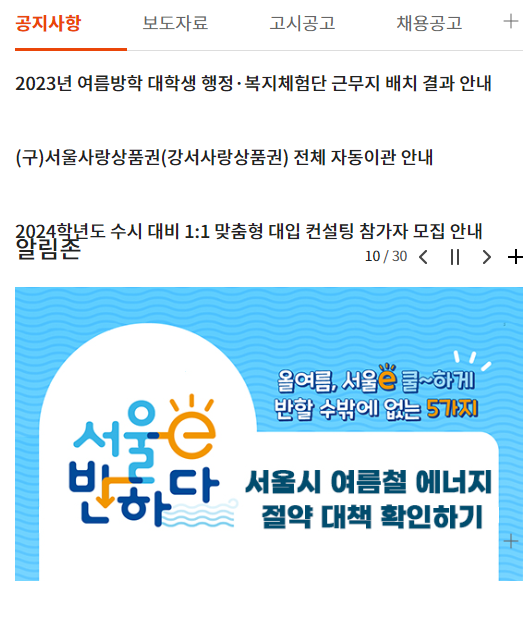 강서구청 홈페이지 공자사항란을 보면 2023년 여름방학 대학생 행정·복지체험단 근무지 배치결과 안내, 서울사랑상품권(강서사랑상품권) 전체 자동이관 안내가 있고 2024학년도 수시 대비 1:1 맞춤형 대입 컨설팅 참가자 모집안내가 있습니다.
