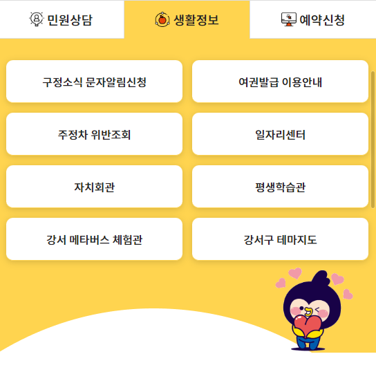 생활정보에는 구정소식 문자알림신청, 여권발급 안내, 주정차 위반조회, 일자리센터, 자치회관, 평생학습관, 강서 메타버스 체험과, 강서구 테마지도 등이 있습니다.