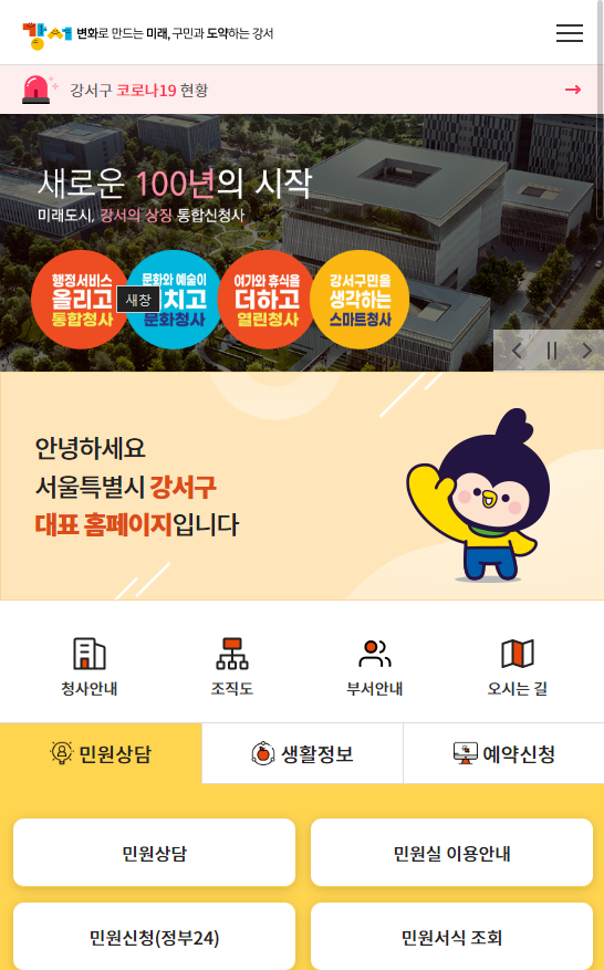 강서구청 홈페이지에서는 청사안내와 조직도, 부서안내 외에도 민원상담과 생활정보 그리고 예약신청으로 이루어져 있습니다.