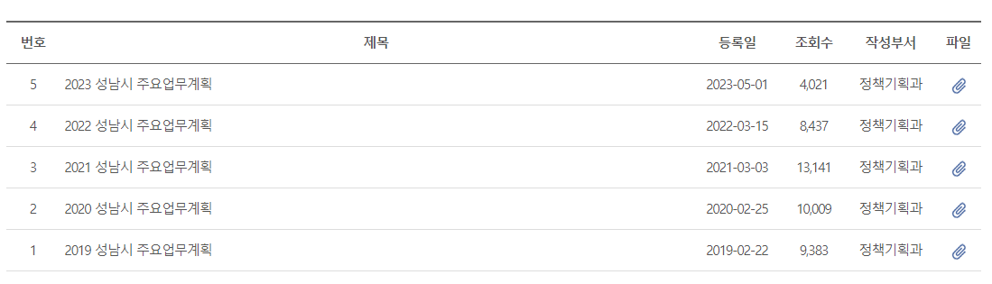 성남시청 홈페이지에서는 주요업무계획을 홈페이지 내 '정보공개'를 통해 공해하는데요. 매년 상반기경에 성남시의 주요업무계획에 대한 내용을 확인할 수 있습니다.