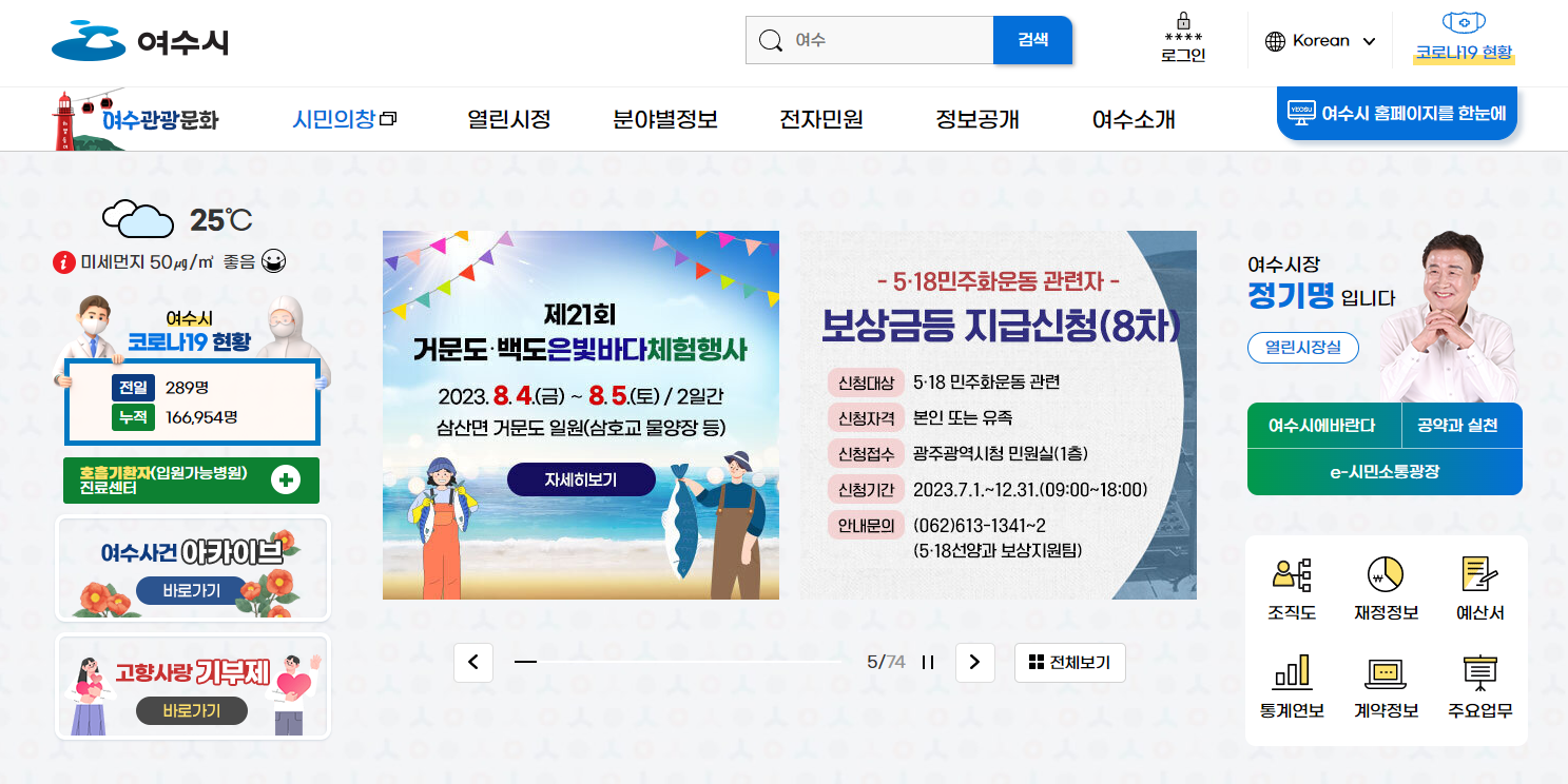 여수시청 홈페이지는 여수시의 시정과 분야별정보, 전자미원, 정보공개 여수소개 등의 정보를 제공하는 웹사이트입니다. 또한, 여수시의 공공시설과 일자리정보 그리고 교육정보 등 다양한 정보를 확인할 수 있습니다.