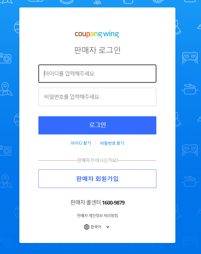 coupang wing 판매자로그인 / 아이디 찾기 / 비밀번호 찾기 / 판매자 회원가입 / 판매자 콜센터 / 1600-9879 / 개인정보 처리방침